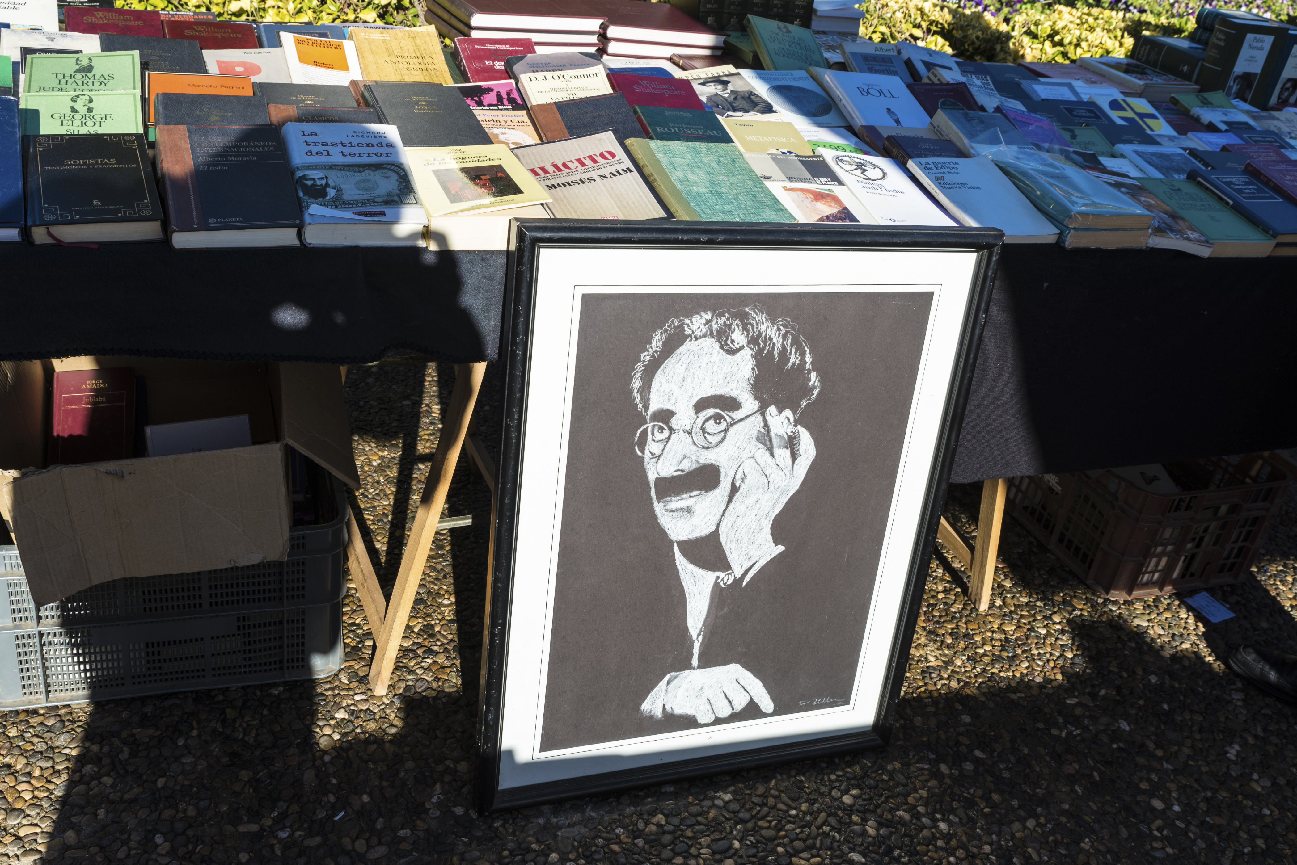 Girona, Spain – December 28, 2014: Objects used, furniture, artwork and ornaments on a market stall in the flea market in Girona, also known as Mercat de la Lleona. This image highlights a drawing of Groucho Marx